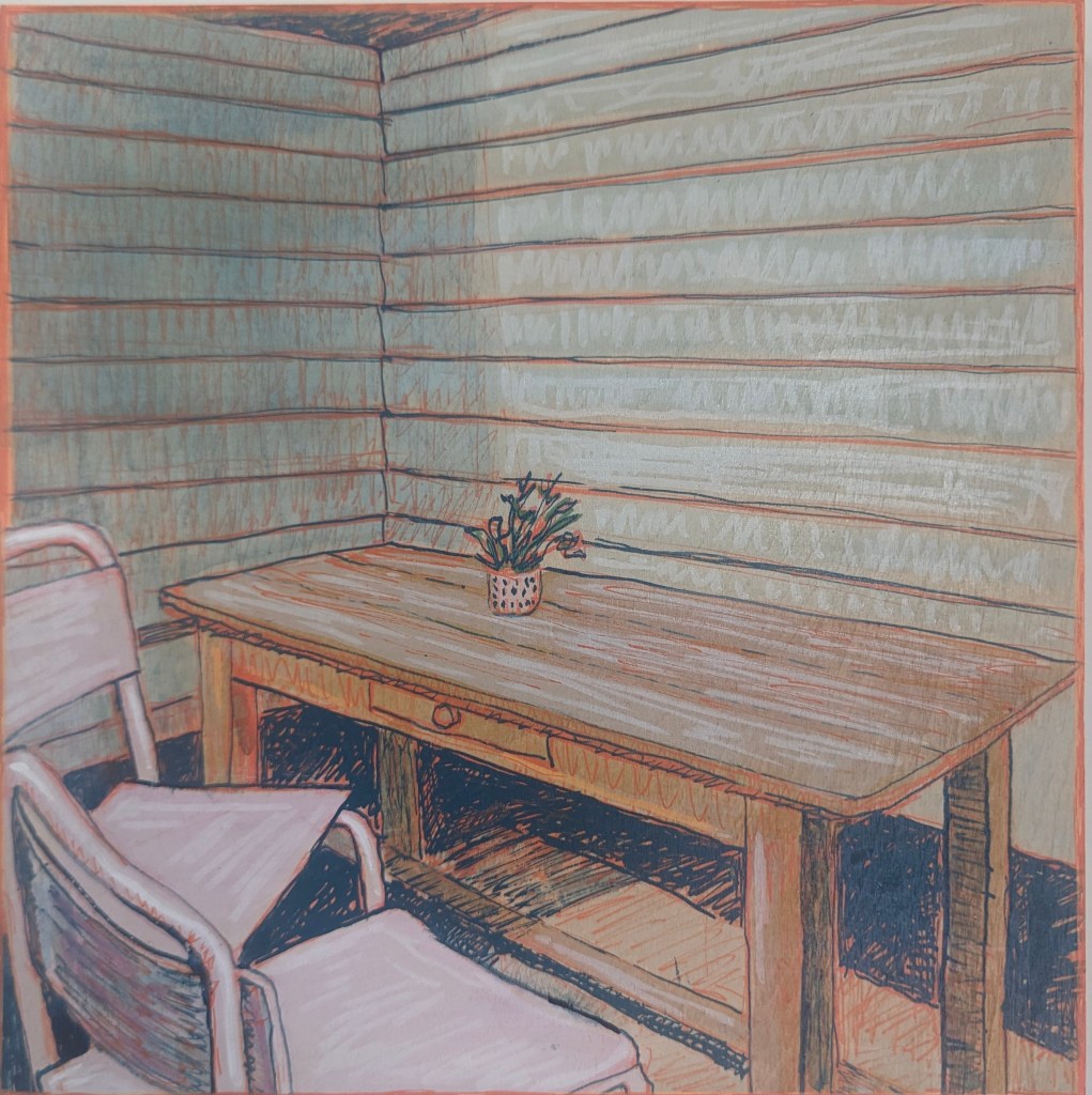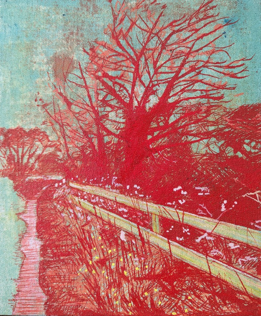 Rachel Burke, a professional visual artist based in County Kilkenny, intricately weaves identity and placement within one’s environment into her work. Her paintings, crafted with acrylic inks on unprimed canvas or wood, evoke a sense of nostalgia through rural landscapes juxtaposed against